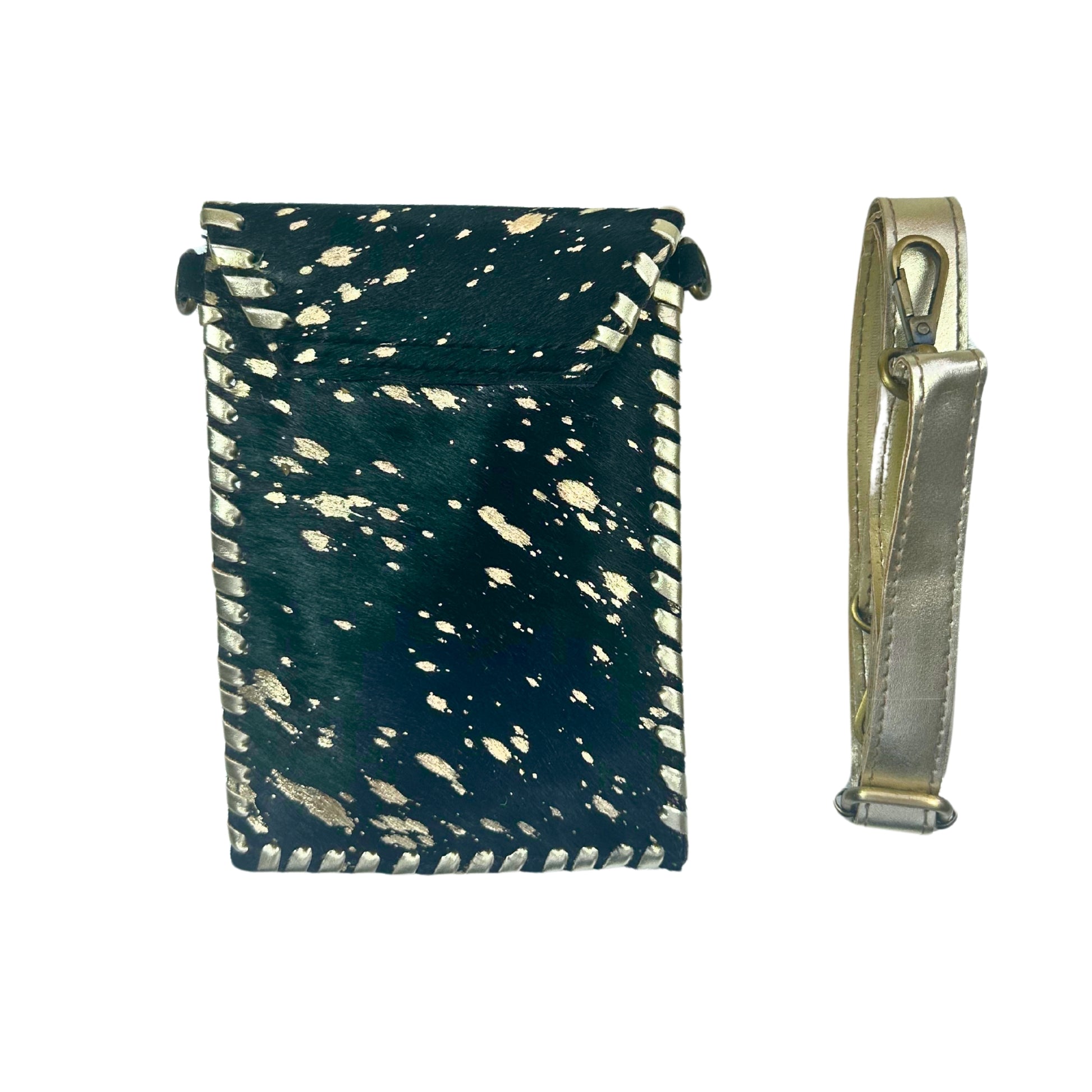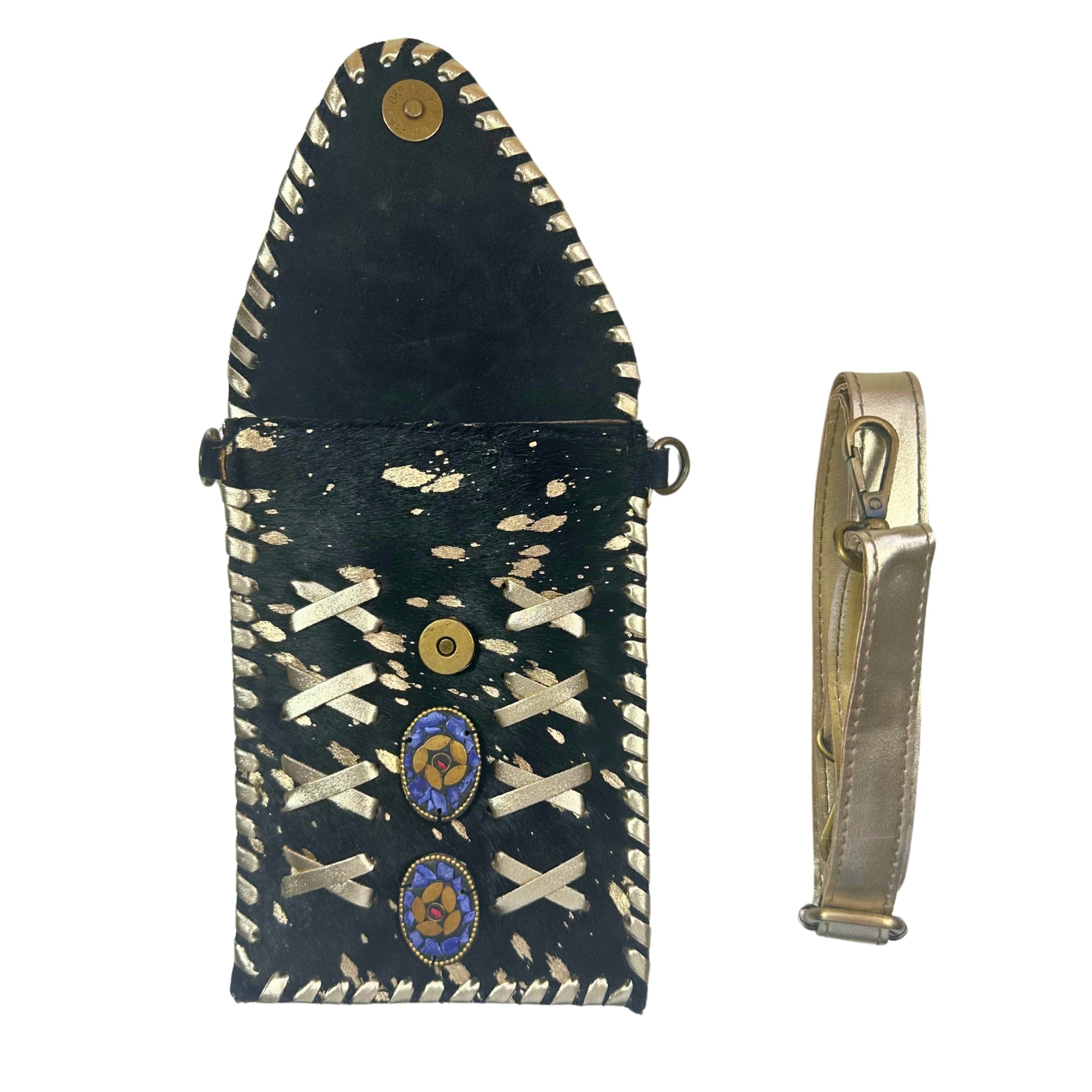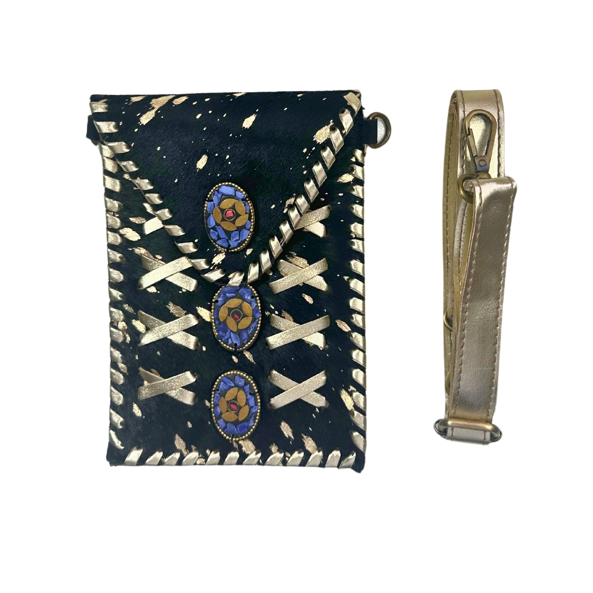 Elegancia en cada detalle. Con unas medidas de 14 x 20 cm, esta bandolera combina la intensidad del cuero negro con pelo natural y el destello sutil de los brillos, rematada con detalles en cuero dorado que le aportan un aire sofisticado y único. Como cada pieza está hecha con cuero natural, su textura y patrón son irrepetibles. Las piedras naturales añaden un toque especial que conecta con lo auténtico. A pesar de su tamaño compacto, tiene espacio para llevar lo esencial: móvil grande, llaves, tarjeta de crédito o un pequeño monedero. Ideal para salir con estilo y ligereza.