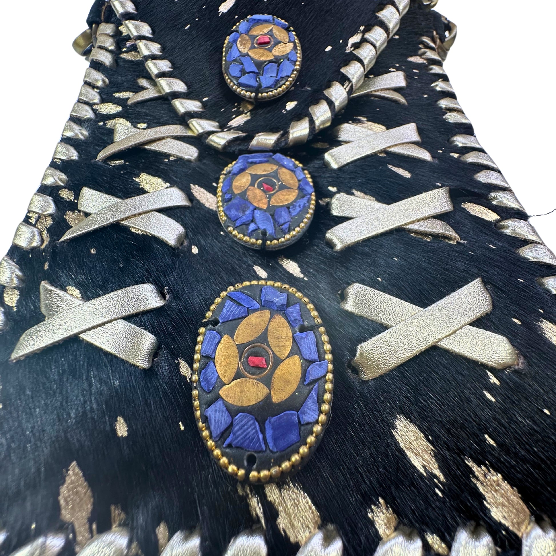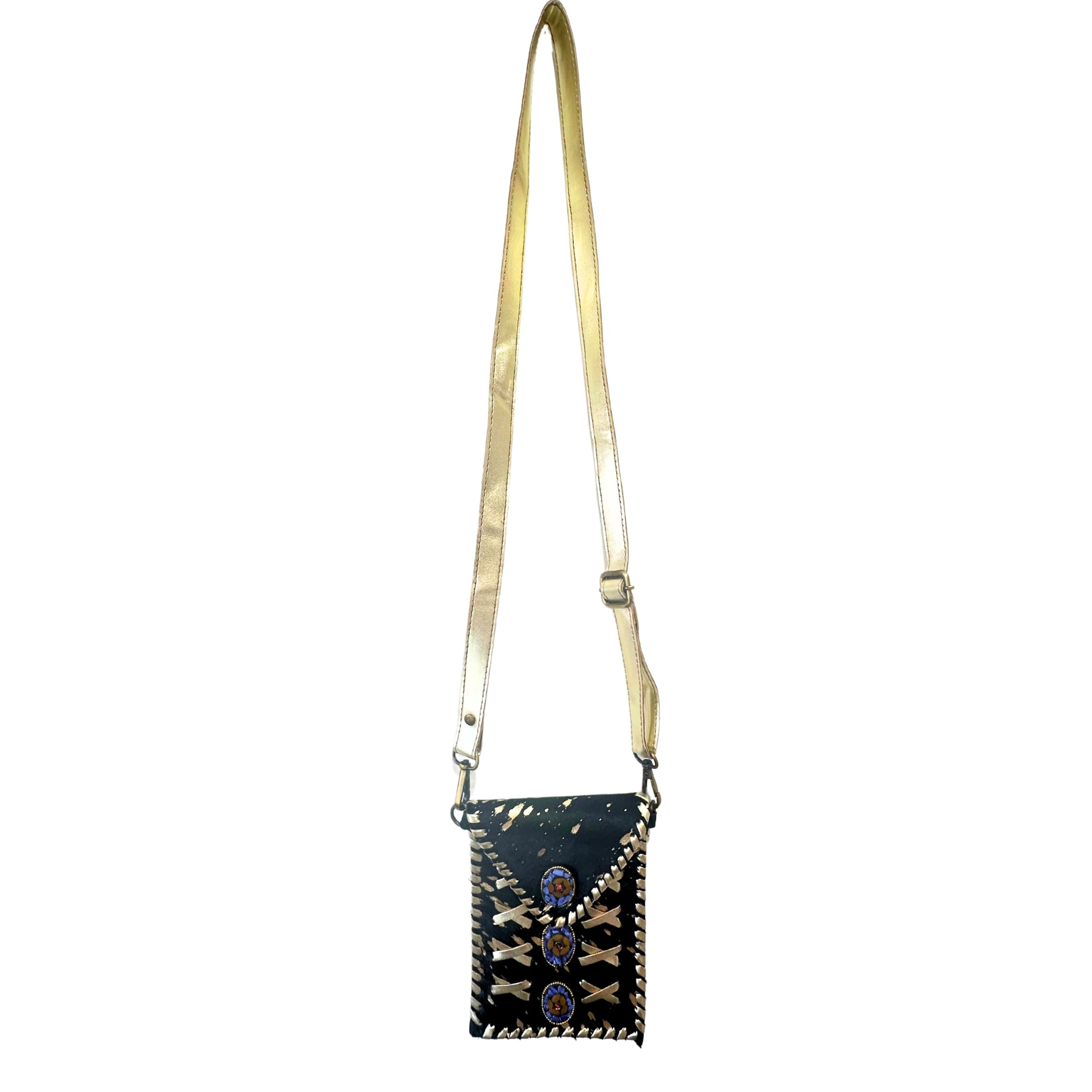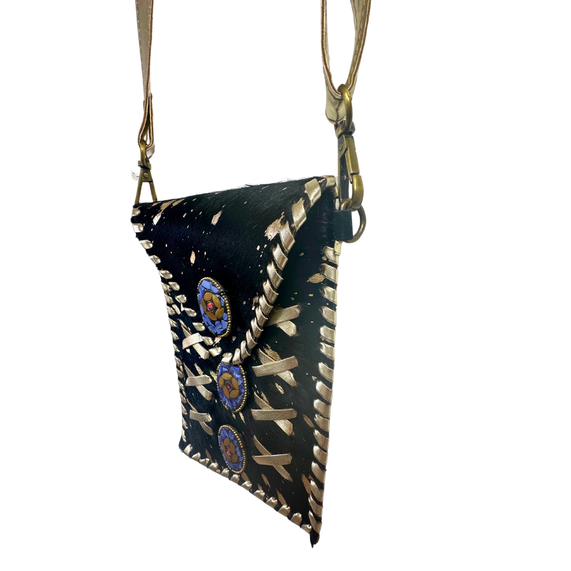 Elegancia en cada detalle. Con unas medidas de 14 x 20 cm, esta bandolera combina la intensidad del cuero negro con pelo natural y el destello sutil de los brillos, rematada con detalles en cuero dorado que le aportan un aire sofisticado y único. Como cada pieza está hecha con cuero natural, su textura y patrón son irrepetibles. Las piedras naturales añaden un toque especial que conecta con lo auténtico. A pesar de su tamaño compacto, tiene espacio para llevar lo esencial: móvil grande, llaves, tarjeta de crédito o un pequeño monedero. Ideal para salir con estilo y ligereza.