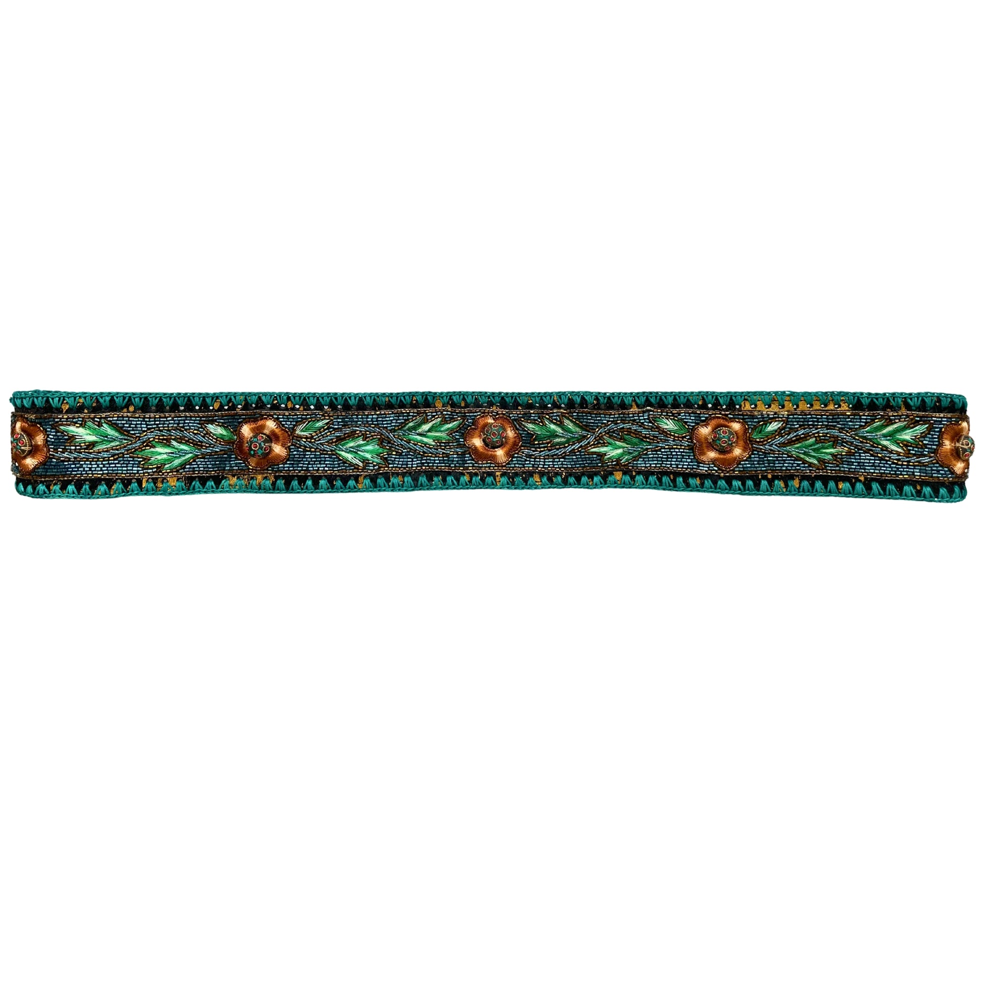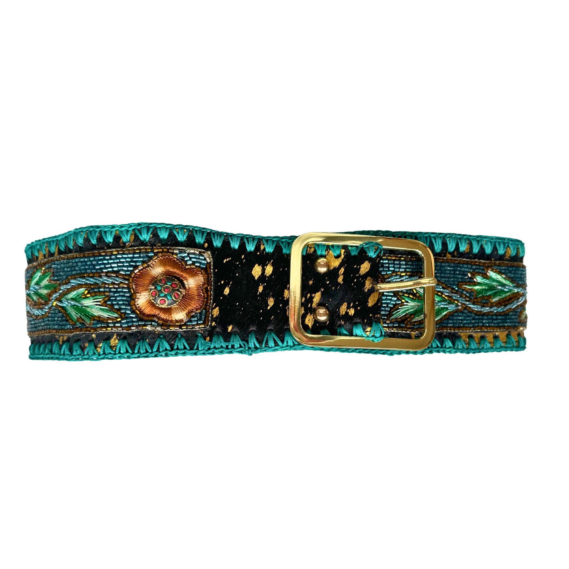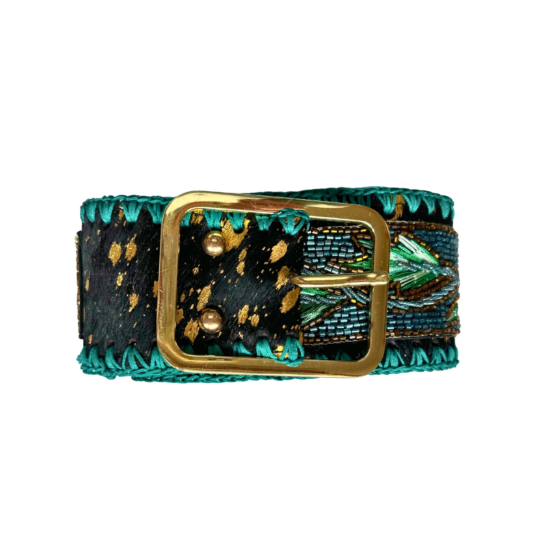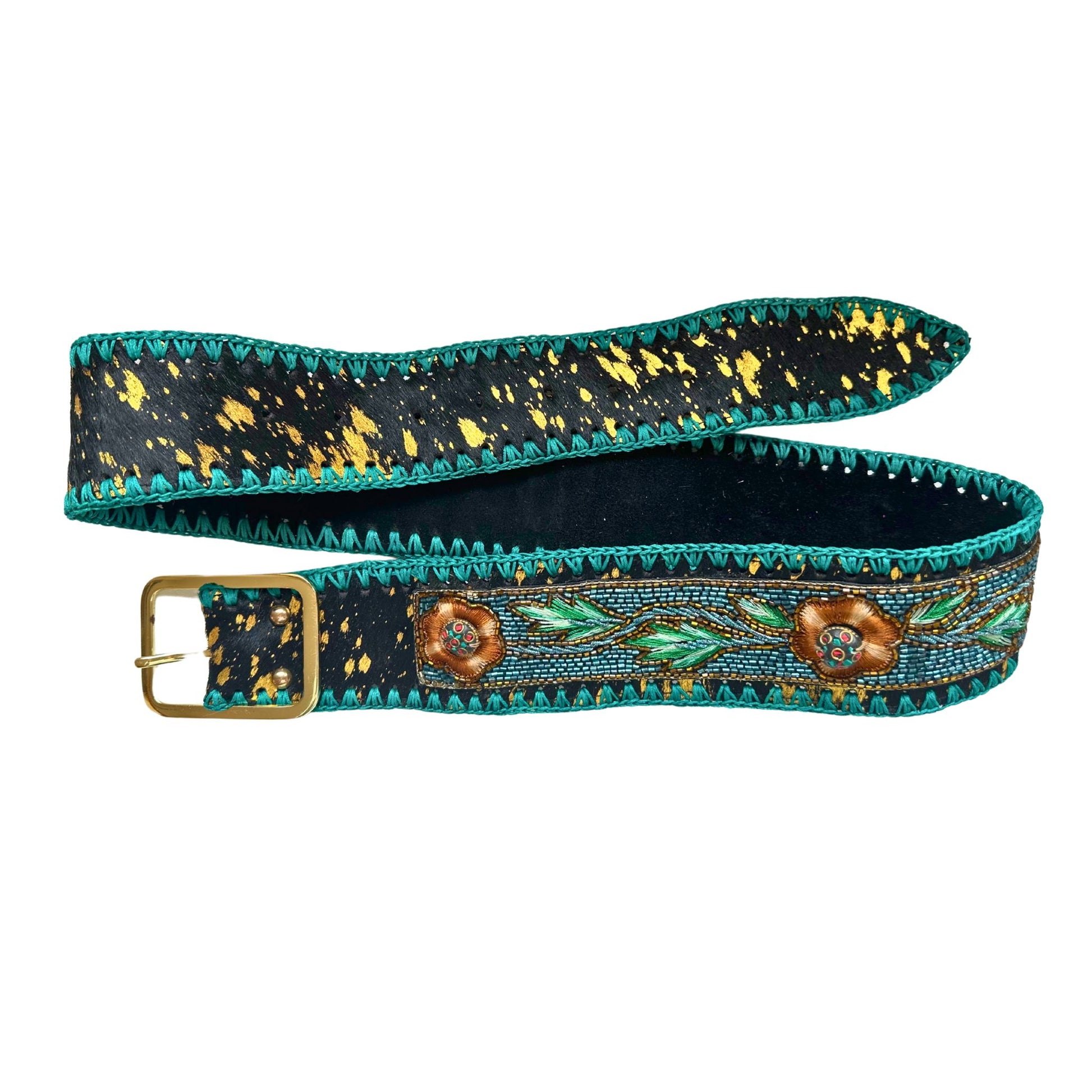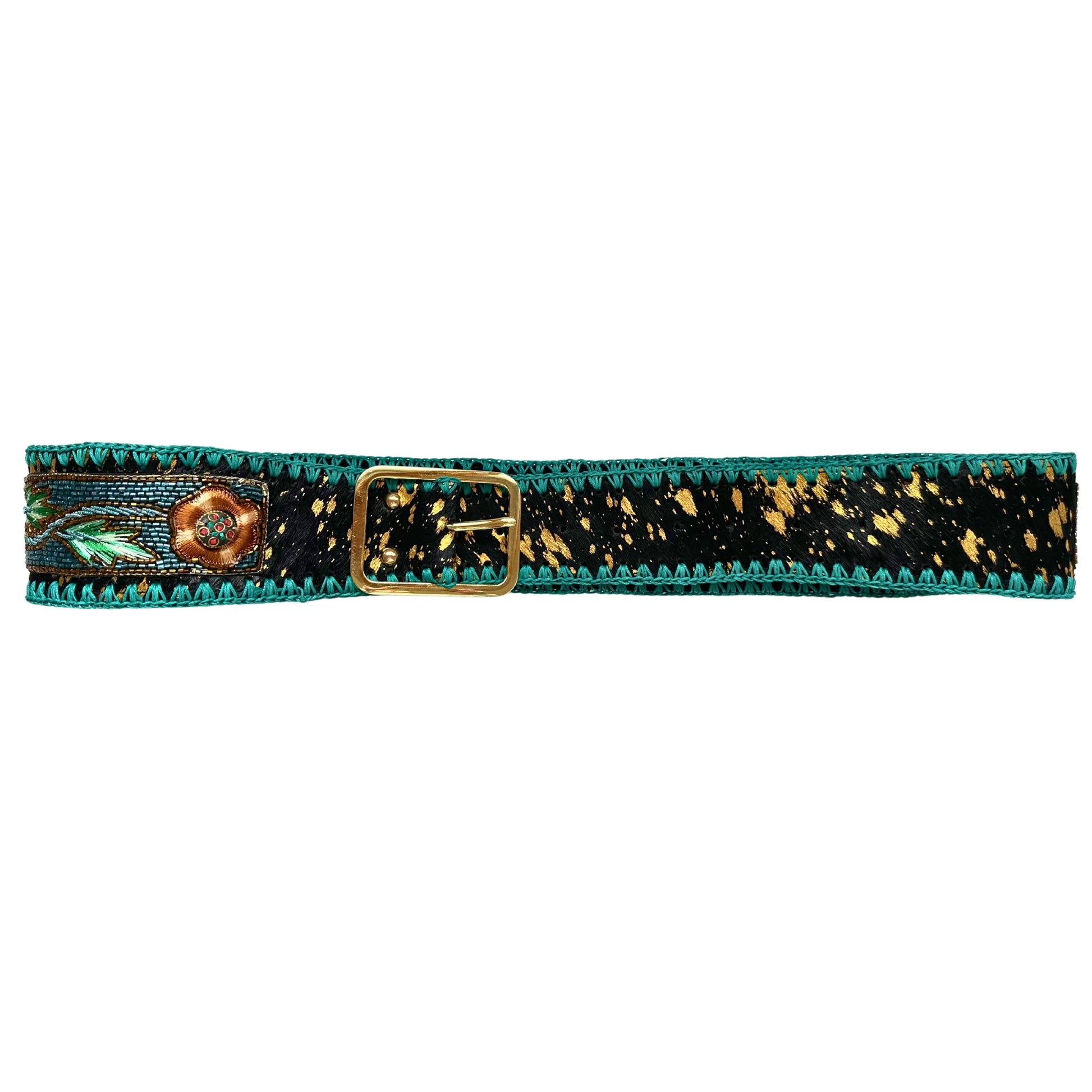 ¡Un clásico renovado con mucho estilo! 😍 Este cinturón de cuero con pelo en color negro destaca por sus remates en hilo turquesa y un bordado de pedrería multicolor que le da un toque único y lleno de vida 🌈💎.