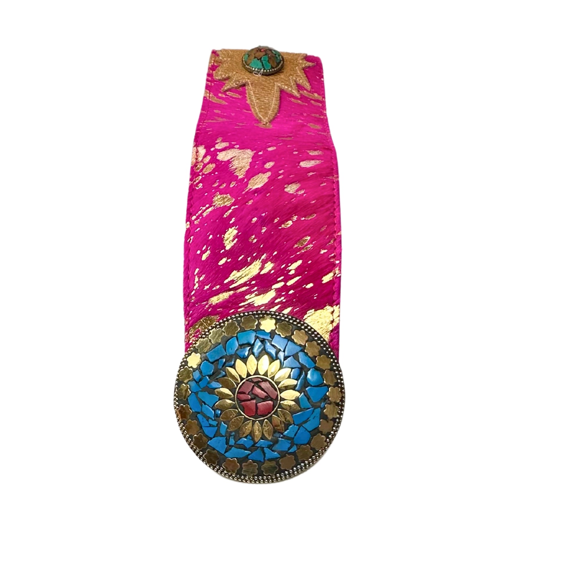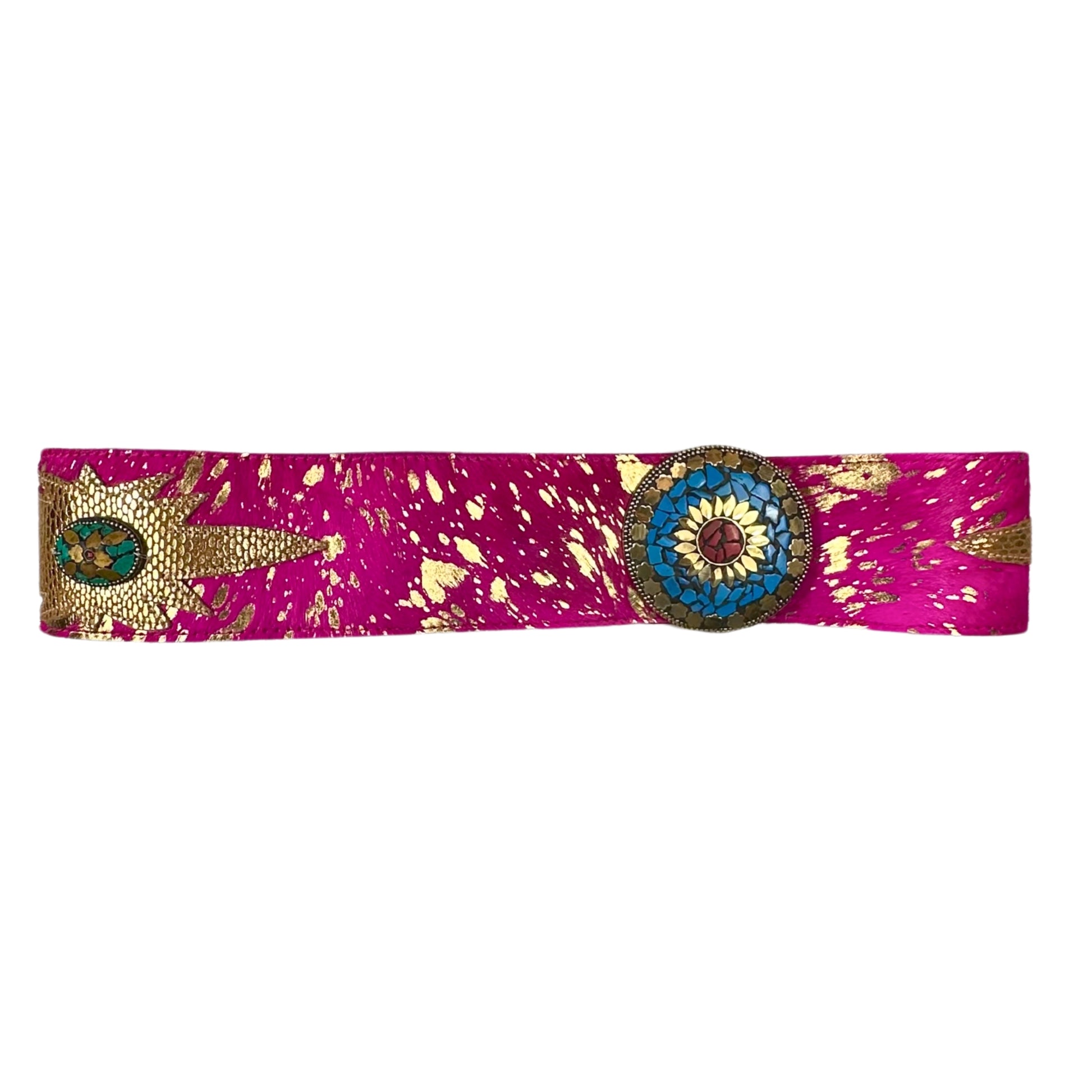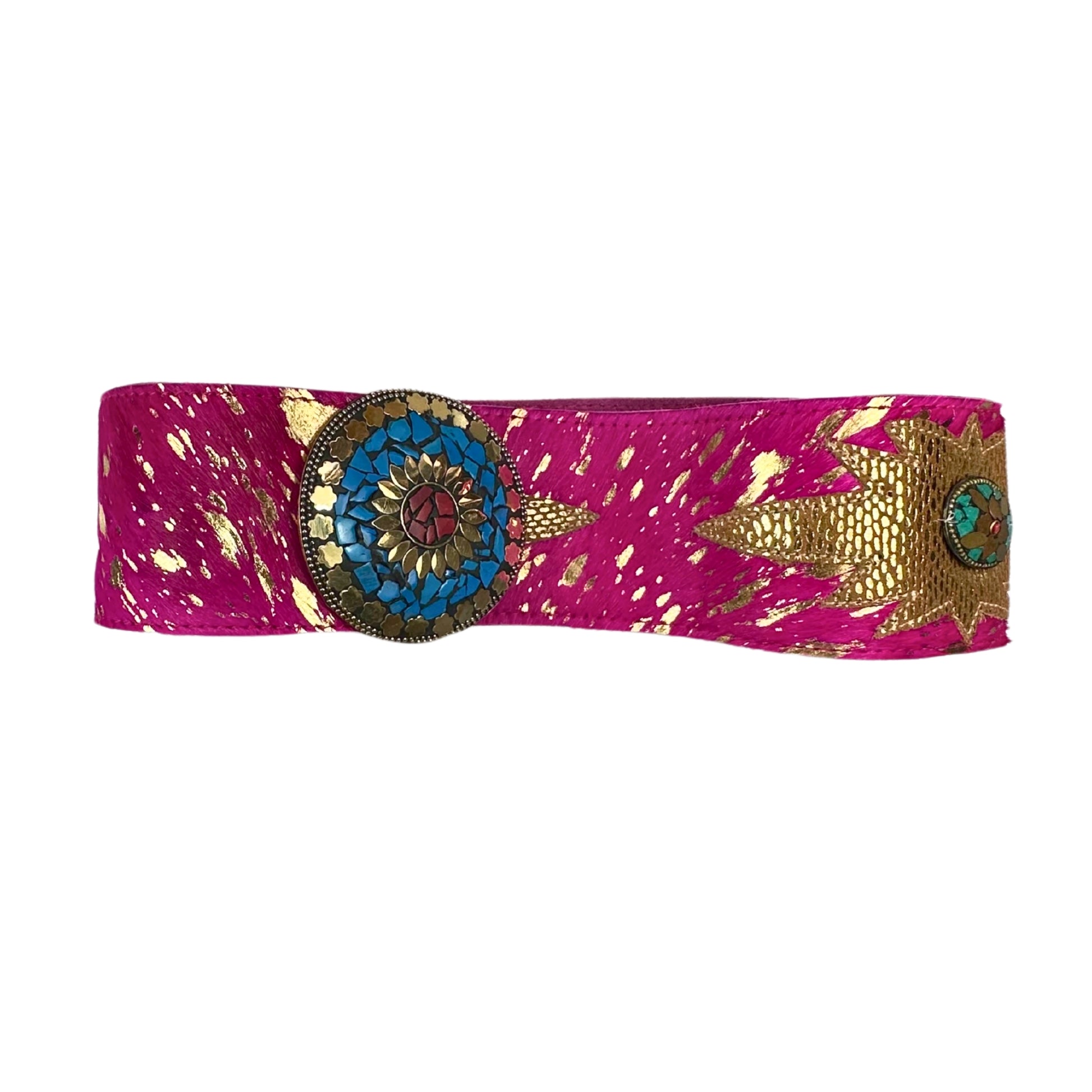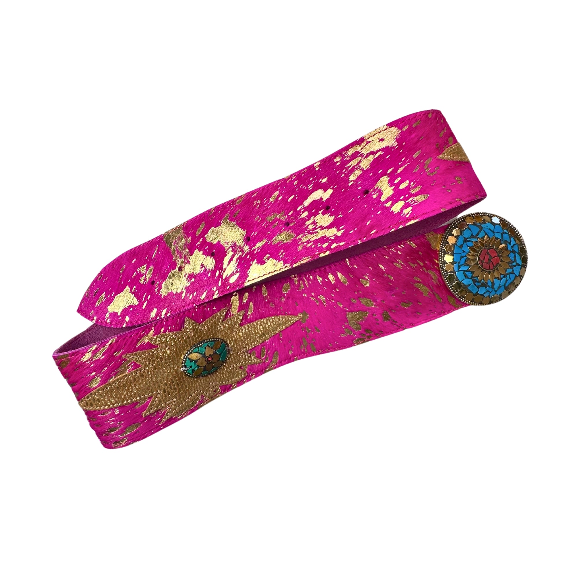 ¡Pura fantasía en forma de cinturón! 🤩 Hecho en cuero con pelo de color fucsia con detalles dorados ✨, incluye tramos de cuero liso con apliques metálicos y piedras naturales que lo hacen una pieza única y llena de carácter 🔮💎.