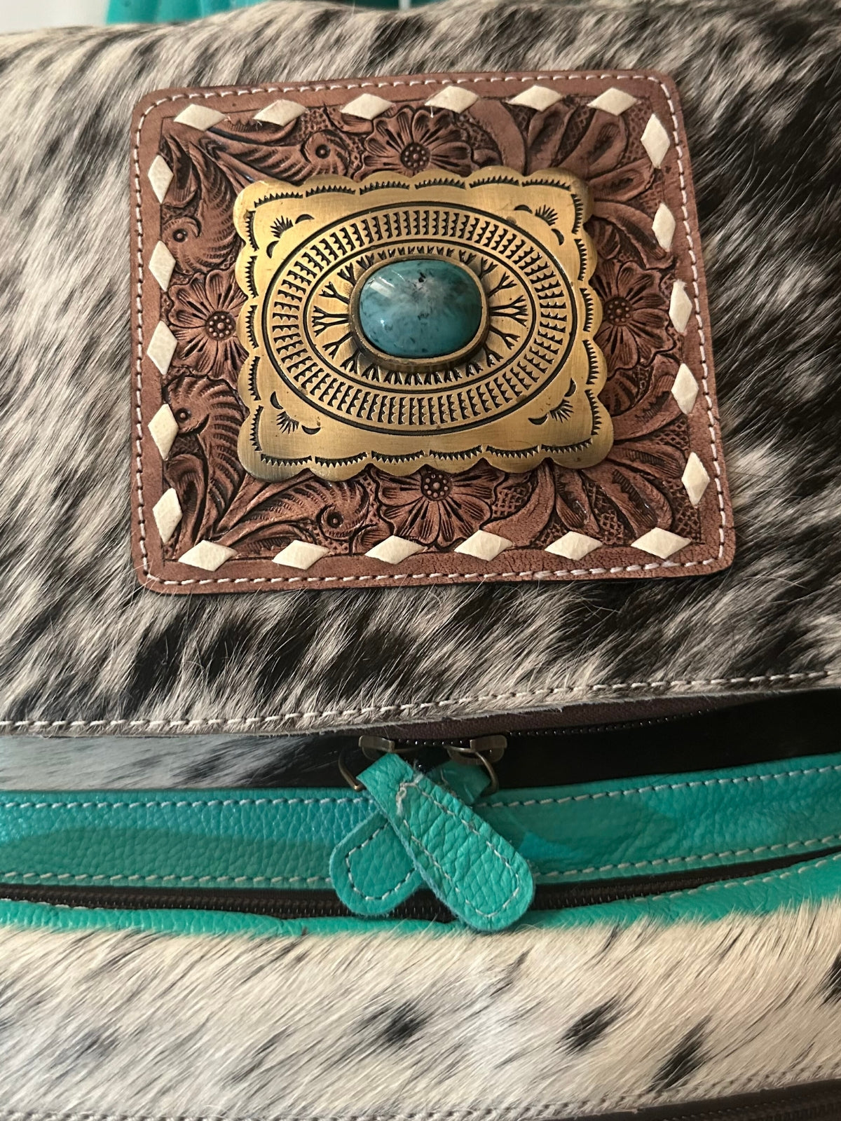 Para las que llevan el mundo a cuestas (¡pero con estilo!). Esta mochila de cuero azul no pasa desapercibida: combina diferentes texturas como cuero liso, cuero grabado y cuero con pelo, creando un juego visual y táctil que la hace única. Sus detalles en piedra natural le dan un toque especial y auténtico. Con varios bolsillos con cremallera y un interior de gran capacidad (sí, casi como una maleta de mano), es ideal para quienes necesitan espacio sin renunciar al diseño.